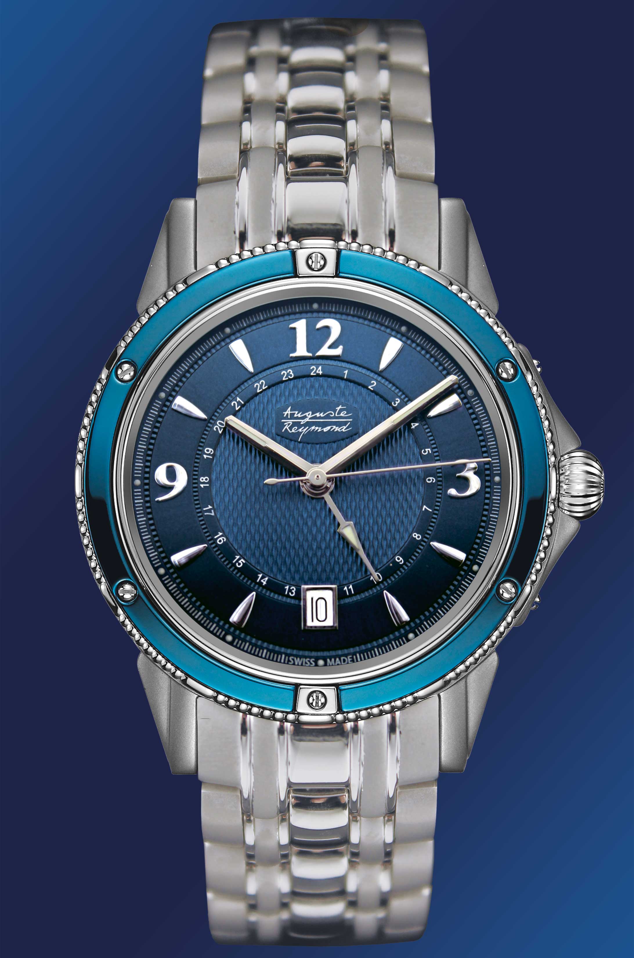 Кварцевый сверхнадежный механизм калибра Ronda 515.24H идеален для активного отдыха, с указателями даты, второго часового пояса и центральной секундной стрелкой. Невесомый титановый корпус с антибликовым сапфировым стеклом, гербовой задней крышкой на 6-ти винтах и завинчивающейся заводной коронкой. Синий циферблат с искусно нанесенным рисунком "Guilloche". Браслет из титана (ширина 20 мм) с клипсой "бабочка". Дополнительная гарантия до 10 лет при покупке в официальных салонах.