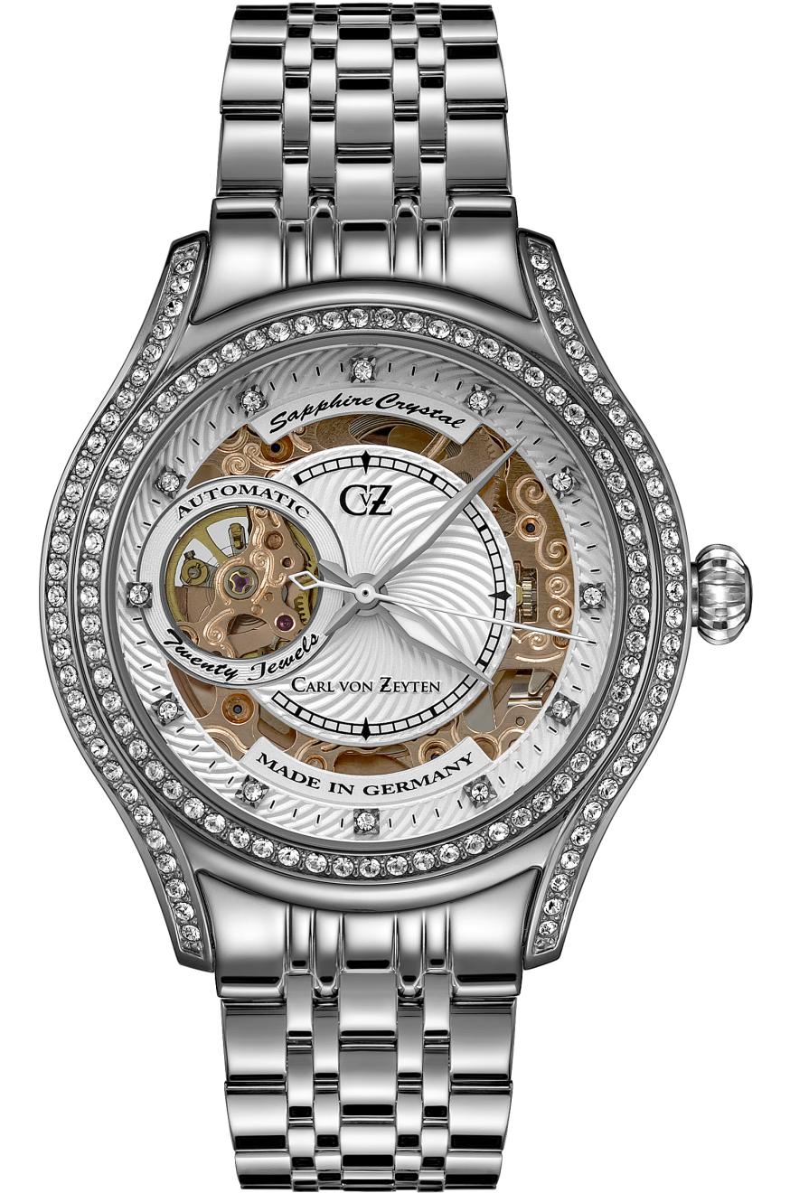 Автоматические женские часы с открытым балансом на 9 часах. Функции: часы, минуты, секунды. Белый циферблат с гильоше. Сапфировое стекло. Корпус из нержавеющей стали 316L украшен стразами. Стальной браслет с раскладывающейся застежкой.