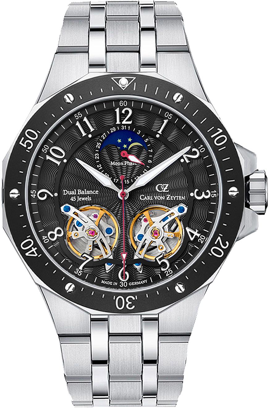 Механические часы с автоподзаводом с двумя открытыми балансами на 6 часах. Функции: часы, минуты, секунды, дата и фазы луны. Корпус из нержавеющей стали 316L с черным PVD покрытием. Сапфировое стекло.Циферблат с гильоше. Вороненые стрелки и винты. Ремень из кожи теленка.