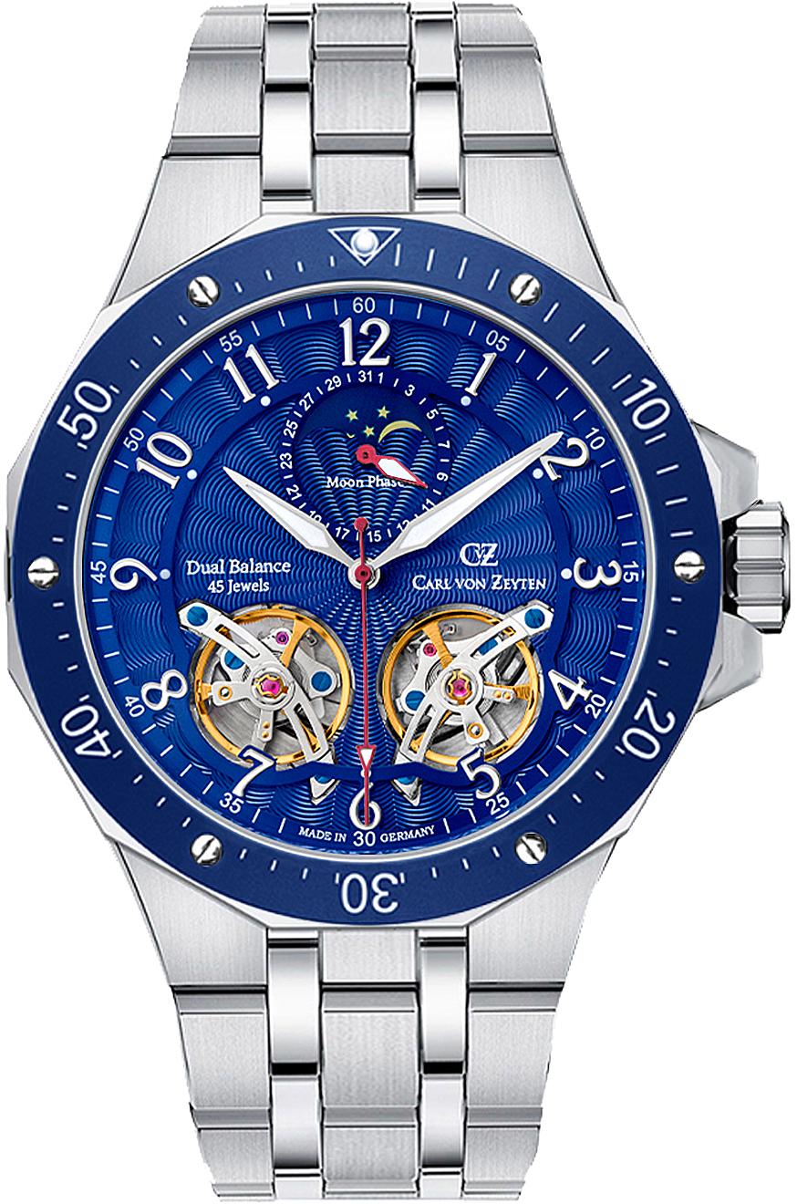 Механические часы с автоподзаводом с двумя открытыми балансами на 6 часах. Функции: часы, минуты, секунды, дата и фазы луны. Корпус из нержавеющей стали 316L с синим PVD покрытием. Водозащита 100 метров. Сапфировое стекло.Циферблат с гильоше. Браслет из нержавеющей стали.