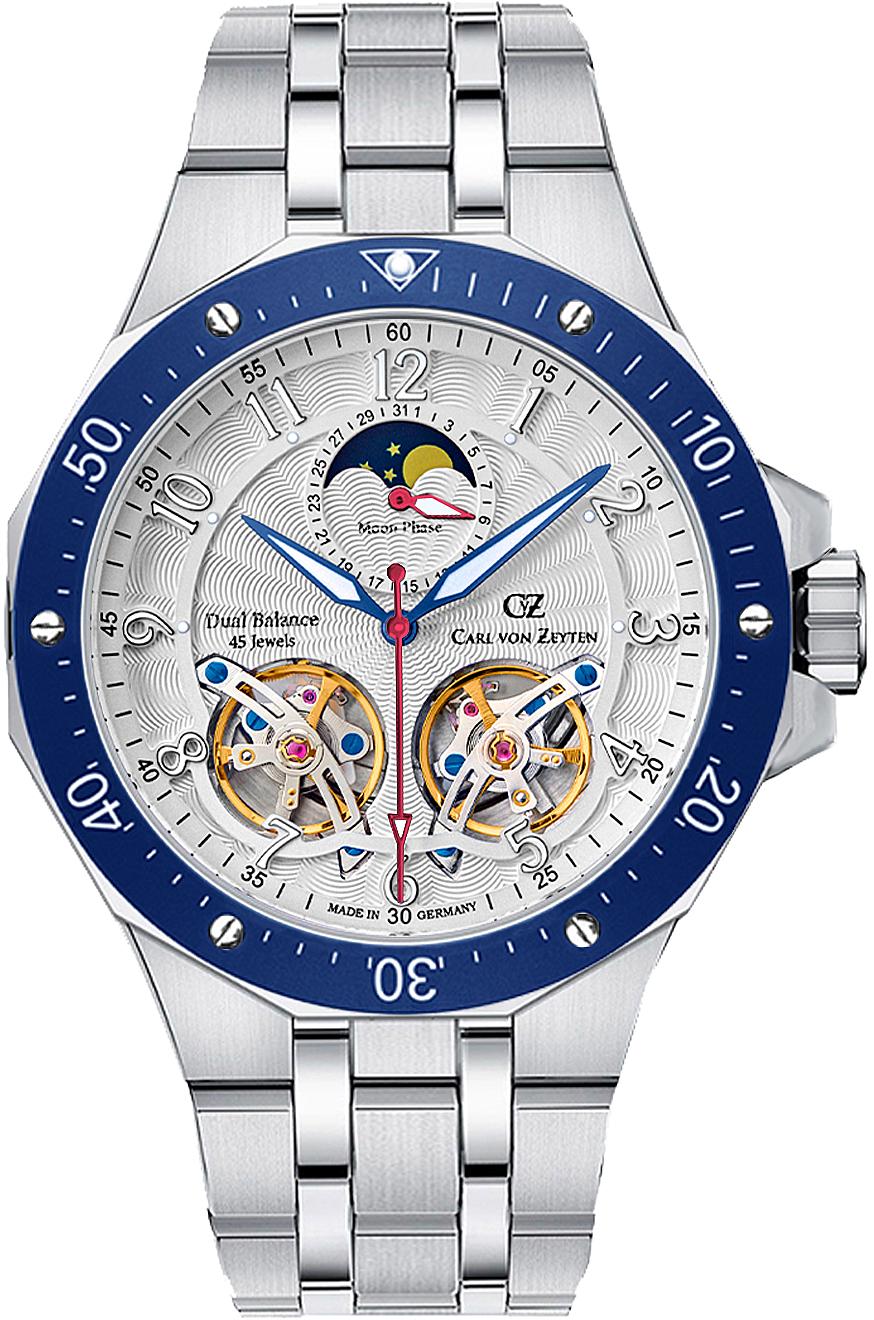 Механические часы с автоподзаводом с двумя открытыми балансами на 6 часах. Функции: часы, минуты, секунды, дата и фазы луны. Корпус из нержавеющей стали 316L с синим PVD покрытием. Водозащита 100 метров. Сапфировое стекло.Циферблат с гильоше. Браслет из нержавеющей стали.