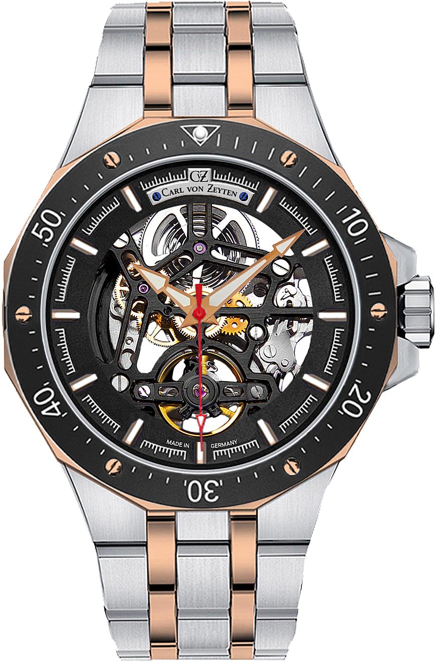Скелетон с автоподзаводом. Функции: часы, минуты. Корпус из нержавеющей стали 316L с черным и розовым PVD покрытием. Сапфировое стекло. Вороненые винты. Браслет из нержавеющей стали. Водозащита 100 метров.