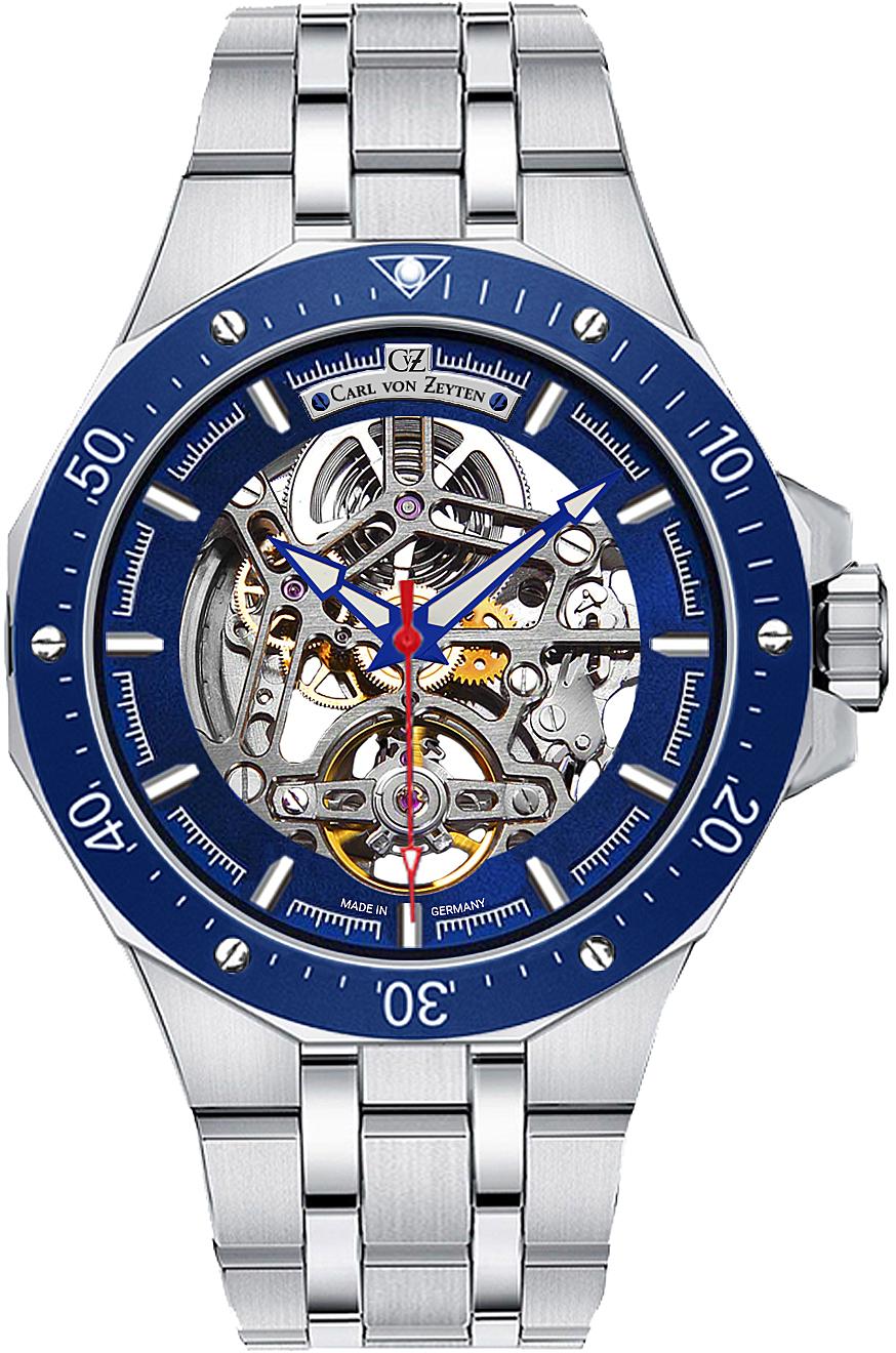 Скелетон с автоподзаводом. Функции: часы, минуты. Корпус из нержавеющей стали 316L с синим PVD покрытием. Сепфировое стекло. Вороненые винты. Браслет из нержавеющей стали. Водозащита 100 метров.